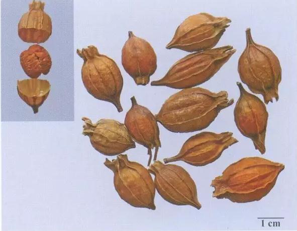 本品呈長卵圓形或橢圓形,長1.5~3.5cm,直徑1~1.5cm。表面紅黃色或棕紅色,具6條翅狀縱棱,棱間常有1條明顯的縱脈紋,并有分枝。頂端殘存萼片,基部稍尖,有殘留果梗。果皮薄而脆,略有光澤;內(nèi)表面色較淺,有光澤,具2~3條隆起的假隔膜。種子多數(shù),扁卵圓形,集結(jié)成團,深紅色或紅黃色,表面密具細小疣狀突起。氣微,味微酸而苦。