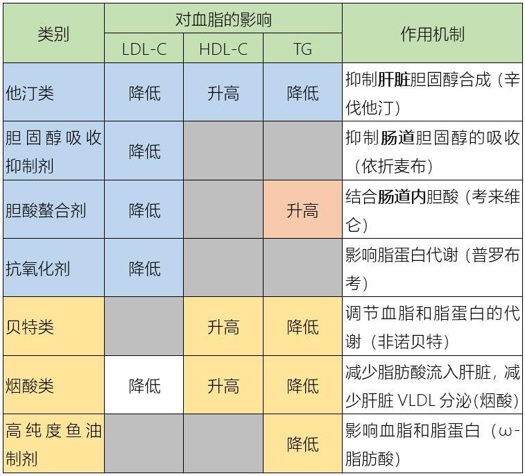 主要降低膽固醇的藥物:①他汀類②膽固醇吸收抑制劑③膽酸螯合劑④抗氧化劑;主要降低甘油三酯的藥物:①貝特類②煙酸類③高純度魚油制劑。