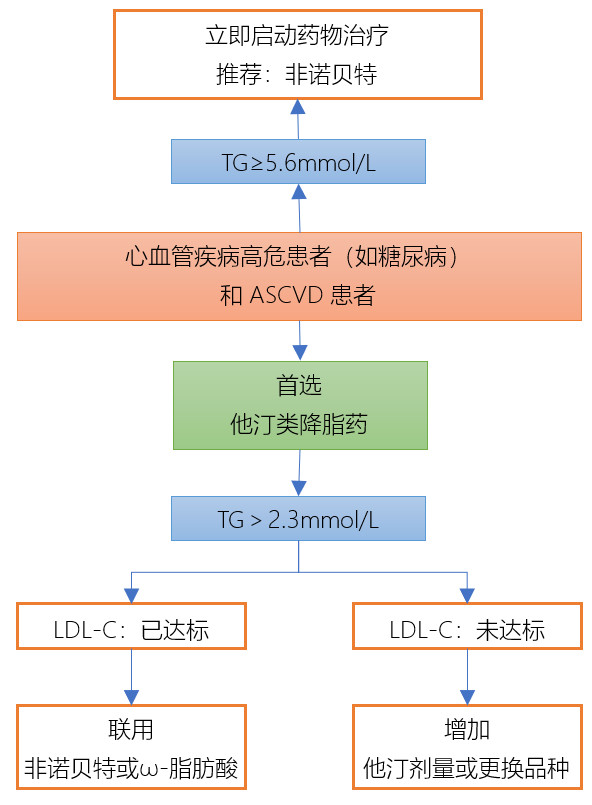 他汀類藥物:是高膽固醇血癥、中度高甘油三酯血癥的首選藥物。當TG≥5.6mmol/L時,需立即啟動非諾貝特治療,預(yù)防急性胰腺炎;LDL-C已達標,但TG仍>2.3mmol/L的ASCVD患者,可以考慮聯(lián)用非諾貝特。