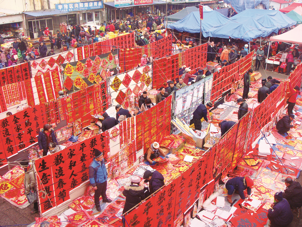老青島人常說,在李村大集“沒有買不到的,只有找不到的”。大集上的交易品種形形色色,柴米油鹽醬醋茶,一應(yīng)俱全;冰糖葫蘆、老旱煙、被罩床單、鍋碗瓢盆等,隨處可見。一年之中最熱鬧和喜慶的要屬臘月集。臘月集上除日常消費(fèi)品,如新衣、新帽、布匹、百貨、食品等種類和數(shù)量都大大增加之外,還有琳瑯滿目的應(yīng)節(jié)年貨,煙花爆竹、年畫春聯(lián)、窗花門神、燈籠蠟燭……李村大集變成一片火紅的海洋。