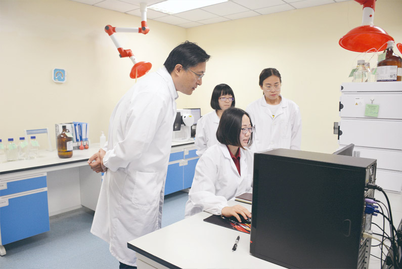 圖②前沿生物藥業(yè)董事長謝東(左一)與科研人員在實驗室進行抗艾滋病新藥質量控制研究。