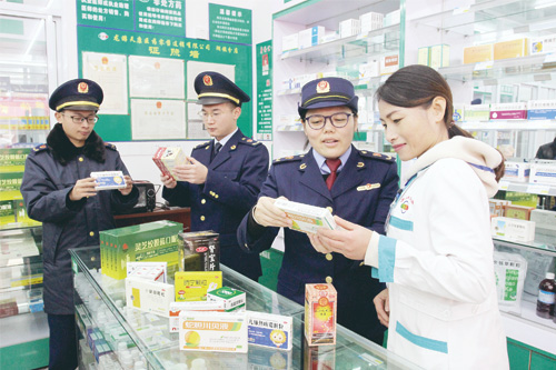 圖為監(jiān)管人員在湖鎮(zhèn)一家藥店檢查藥品保質(zhì)期。江友富 楊宇航 攝影報(bào)道