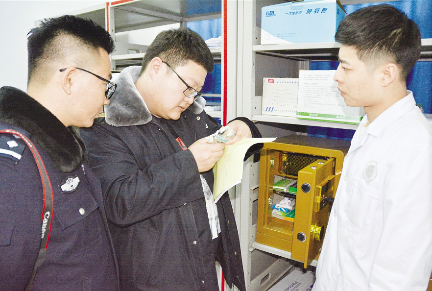 近日,內(nèi)蒙古自治區(qū)西烏珠穆沁旗食藥工商質(zhì)監(jiān)局聯(lián)合公安部門,對醫(yī)療機(jī)構(gòu)開展麻醉藥品和第一類精神藥品監(jiān)督檢查,重點(diǎn)檢查藥品采購、運(yùn)輸、驗(yàn)收環(huán)節(jié)管理情況,并對照藥品購進(jìn)、出入庫記錄等賬目,對麻精藥品數(shù)量進(jìn)行核對。圖為檢查現(xiàn)場。