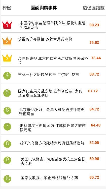 醫(yī)藥輿情排行榜|中國擬對疫苗管理單獨立法