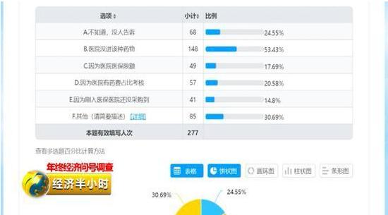 《經(jīng)濟(jì)半小時(shí)》記者與“與癌共舞”網(wǎng)絡(luò)論壇合作的一份調(diào)查問卷顯示,截止到2018年12月16日,在504份問卷統(tǒng)計(jì)中,54.9%的患者存在買不到醫(yī)??拱┧幍膯栴},其中53.4%的患者面臨的主要問題是,醫(yī)院明確表示不進(jìn)醫(yī)??拱┧?。