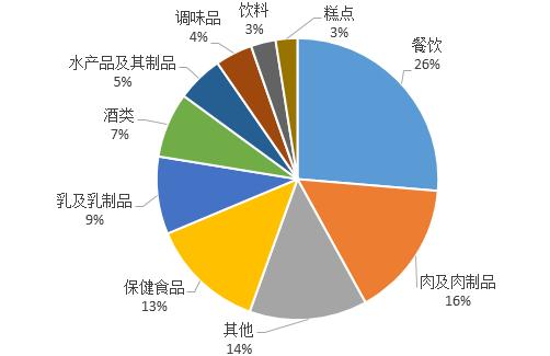 從食品輿情事件涉及的品類來看,如圖7所示,餐飲依然是問題比較集中的行業(yè),占比超過26%,其次肉及肉制品占比16%、保健食品占比達(dá)到13%,乳及乳制品占比9%、酒類占比7%。