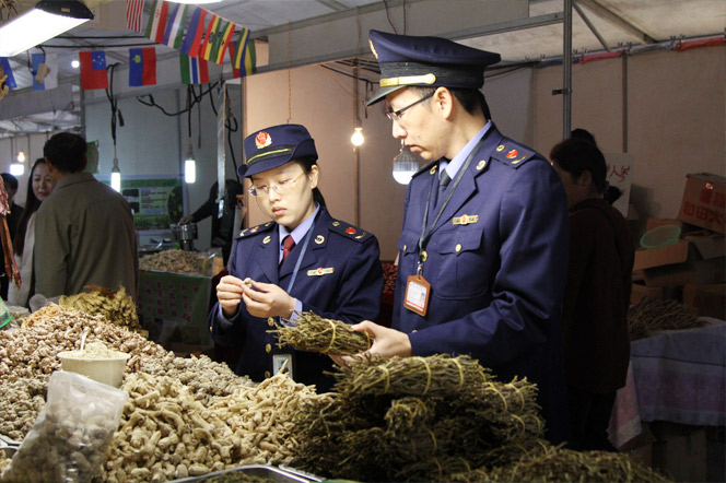 近日,浙江省象山縣市場監(jiān)管局組織開展展銷會藥械監(jiān)管專項行動,加強對參展中藥材及醫(yī)療器械的質(zhì)量監(jiān)管。圖為執(zhí)法人員在展銷會一家攤位前檢查中藥材。姜琪妍 攝