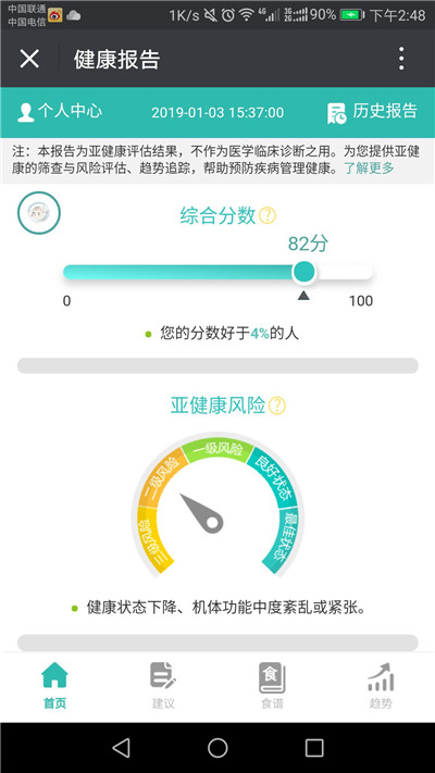 檢測結(jié)果出來后,記者嚇了一跳:健康報告顯示"您的綜合分?jǐn)?shù)為82分,好于4%的人,處于二級亞健康風(fēng)險。健康狀態(tài)下降、機(jī)體功能中度紊亂或緊張,情緒偶有悲觀厭世,睡眠質(zhì)量有待改善"。在"實時狀態(tài)"一欄中顯示,反應(yīng)力接近為零,腦力、缺水、缺氧等指標(biāo)也剛剛高于滿分的一半,同時存在免疫蛋白球輕微異常、胃蠕動和胃吸收能力偏弱、脂代謝偏弱、前列腺增生等問題。這跟自己兩個月前的體檢結(jié)果——身體各項指標(biāo)均正常有很大差異。難道短短兩個月的時間,身體狀況就"垮掉"了?記者不禁驚出了一身冷汗。