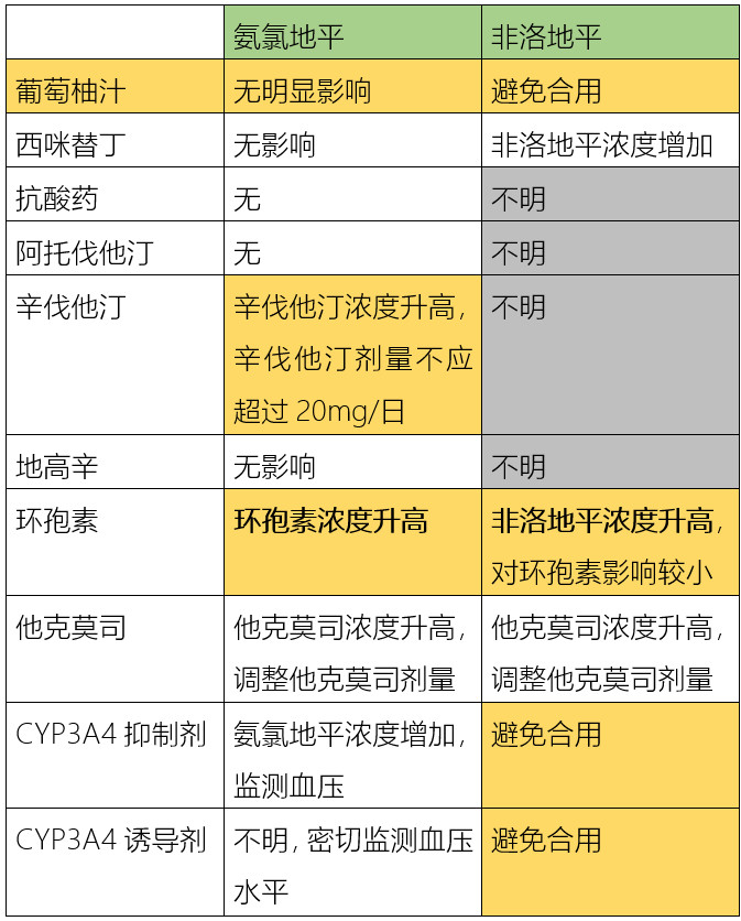 氨氯地平和非洛地平主要通過肝藥酶CYP3A4代謝,可與CYP3A4抑制劑、CYP3A4誘導(dǎo)劑發(fā)生顯著的相互作用。