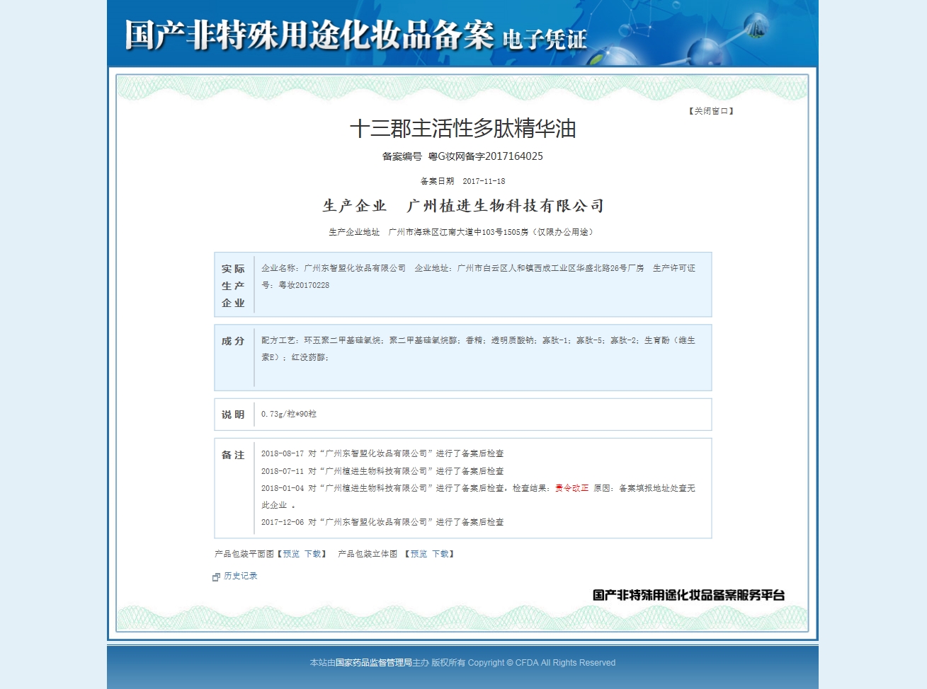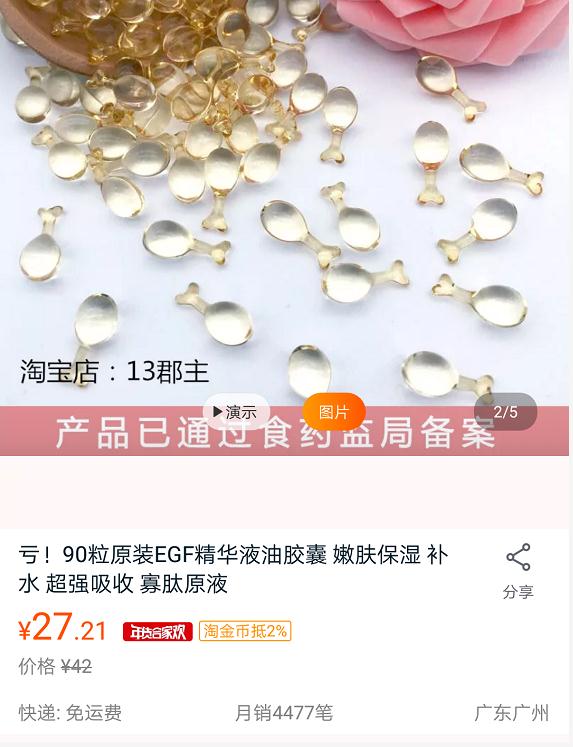 更有甚者,有些化妝品打著“EGF”的旗號(hào)宣傳,實(shí)際成分里卻沒有它。比如,五皇冠淘寶店鋪“13郡主”銷量最高的一款EGF精華液油膠囊,產(chǎn)品成分顯示主要從羊奶和一些動(dòng)物蛋白質(zhì)中提取有效成分,并且特別標(biāo)注該產(chǎn)品已通過藥品監(jiān)管部門備案。記者在國(guó)家藥監(jiān)局官網(wǎng)查詢國(guó)產(chǎn)非特殊用途化妝品備案信息發(fā)現(xiàn),該產(chǎn)品名稱為十三郡主活性多肽精華油,在其成分表中見不到EGF,只是含有寡肽-1、寡肽-2等成分。像這種化妝品商給寡肽-1產(chǎn)品貼上“EGF”標(biāo)簽來宣稱功效的現(xiàn)象在淘寶上頗為常見。(部分天貓?jiān)谑圻`法宣傳產(chǎn)品匯總見文末附圖)