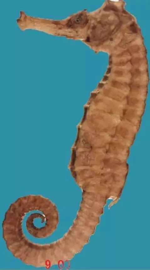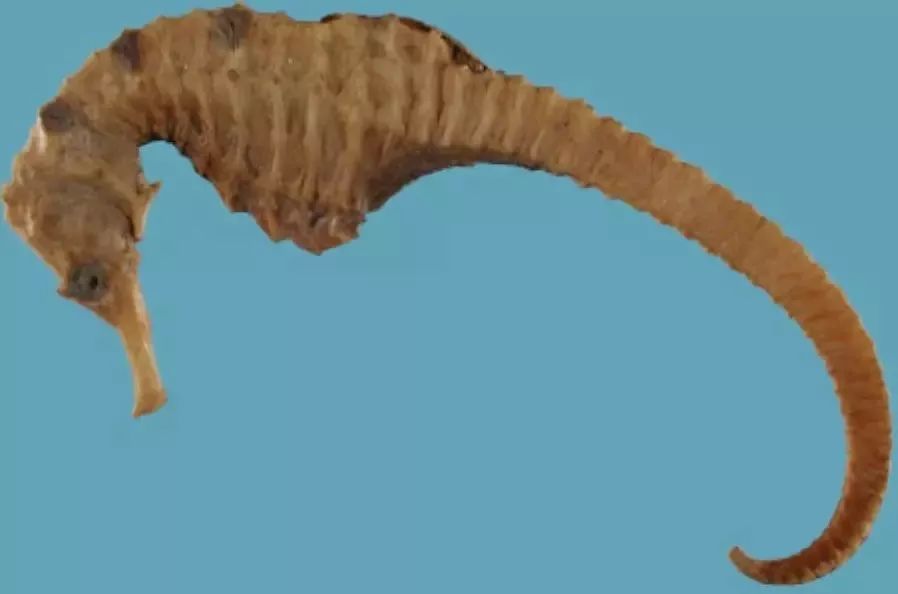 線紋海馬:呈扁長(zhǎng)形而彎曲,體長(zhǎng)約30cm。表面黃白色。頭略似馬頭,有冠狀突起,具管狀長(zhǎng)吻,口小,無(wú)牙,兩眼深陷。軀干部七棱形,尾部四棱形,漸細(xì)卷曲,體上有瓦楞形的節(jié)紋并具短棘。體輕,骨質(zhì),堅(jiān)硬。氣微腥,味微咸。