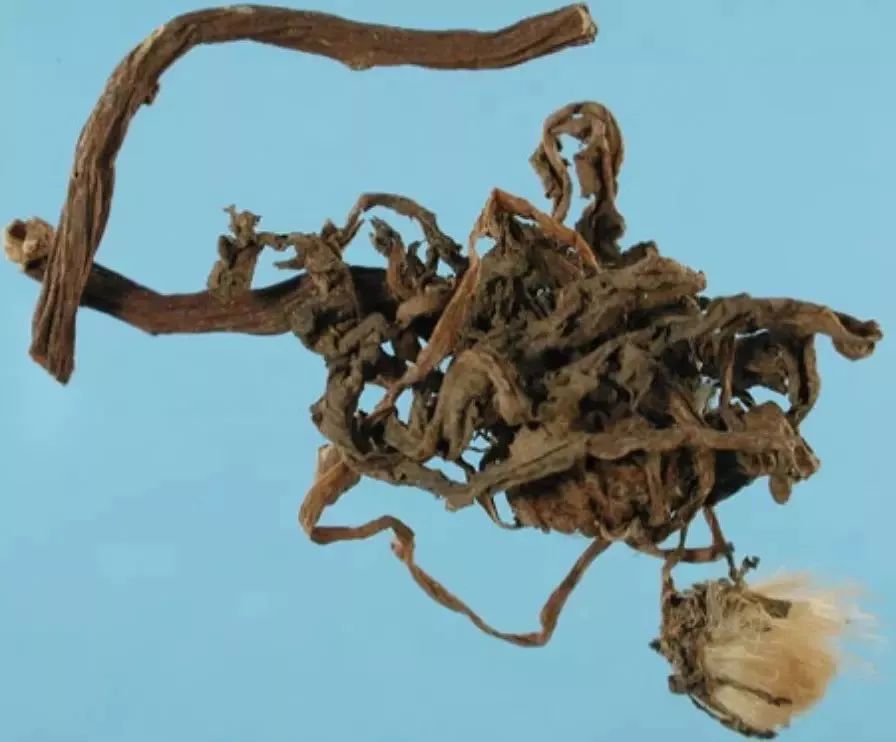 性狀鑒別:本品呈皺縮卷曲的團(tuán)塊。根呈圓錐狀,多彎曲,長(zhǎng)3~7cm;表面棕褐色,抽皺;根頭部有棕褐色或黃白色的茸毛,有的已脫落。葉基生,多皺縮破碎,完整葉片呈倒披針形,綠褐色或暗灰綠色,先端尖或鈍,邊緣淺裂或羽狀分裂,基部漸狹,下延呈柄狀,下表面主脈明顯?;ㄇo1至數(shù)條,每條頂生頭狀花序,總苞片多層,內(nèi)面一層較長(zhǎng),花冠黃褐色或淡黃白色。有的可見多數(shù)具白色冠毛的長(zhǎng)橢圓形瘦果。氣微,味微苦。