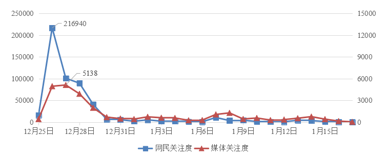 從輿情走勢來看,以2018年12月25日~2019年1月17日為監(jiān)測時間段,如圖1所示,輿情整體呈現(xiàn)“山峰式”特征,網(wǎng)民表現(xiàn)出較高關(guān)注度。微博占比超過九成。