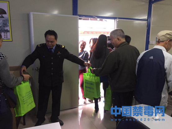 圖為執(zhí)法人員向社區(qū)群眾派發(fā)禁毒宣傳資料。中國禁毒網發(fā)