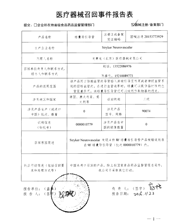史賽克(北京)醫(yī)療器械有限公司報告,由于涉及產(chǎn)品存在錯誤包裝問題,生產(chǎn)商Stryker Neurovascula對球囊導(dǎo)引導(dǎo)管(注冊證編號:國械注進20153773929)主動召回。召回級別為三級。涉及產(chǎn)品的型號、規(guī)格及批次等詳細信息見《醫(yī)療器械召回事件報告表》。