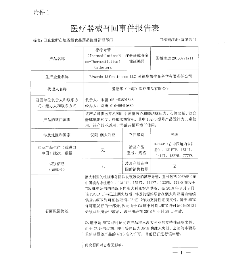 愛德華(上海)醫(yī)療用品有限公司報告,由于涉及產(chǎn)品CA證書過期,生產(chǎn)商Edwards Lifesciences LLC對漂浮導(dǎo)管(注冊證編號:國械注進20163774711)主動召回。召回級別為三級。涉及產(chǎn)品的型號、規(guī)格及批次等詳細(xì)信息見《醫(yī)療器械召回事件報告表》。
