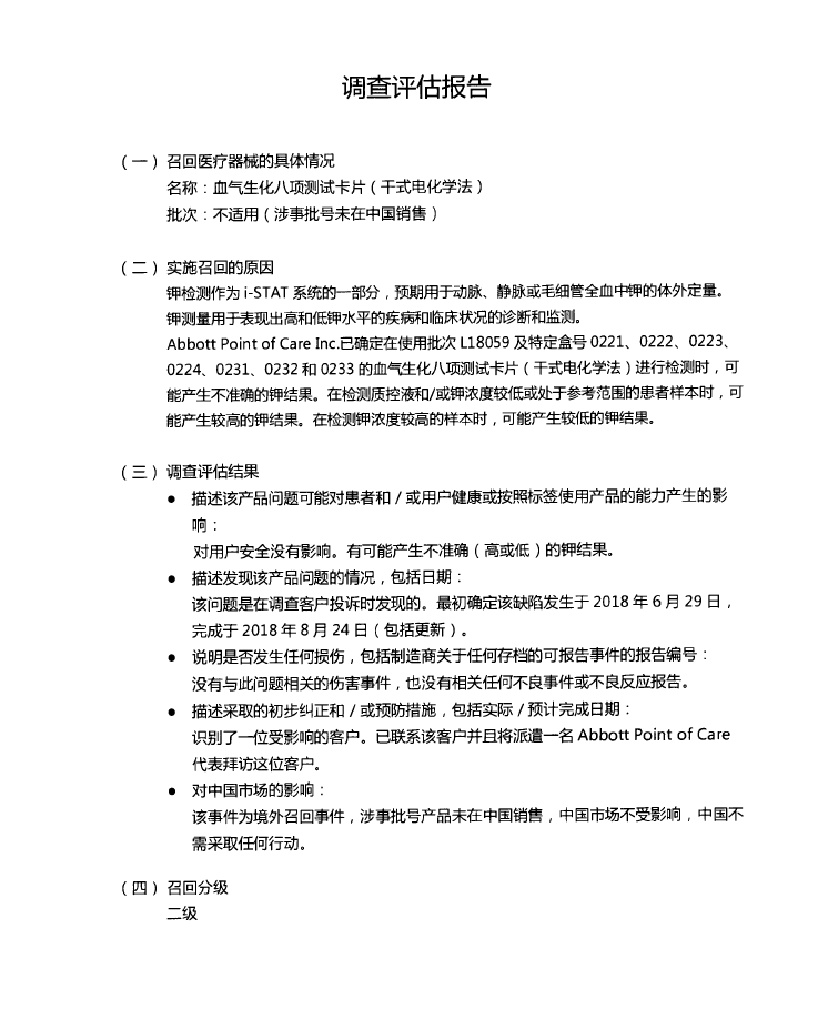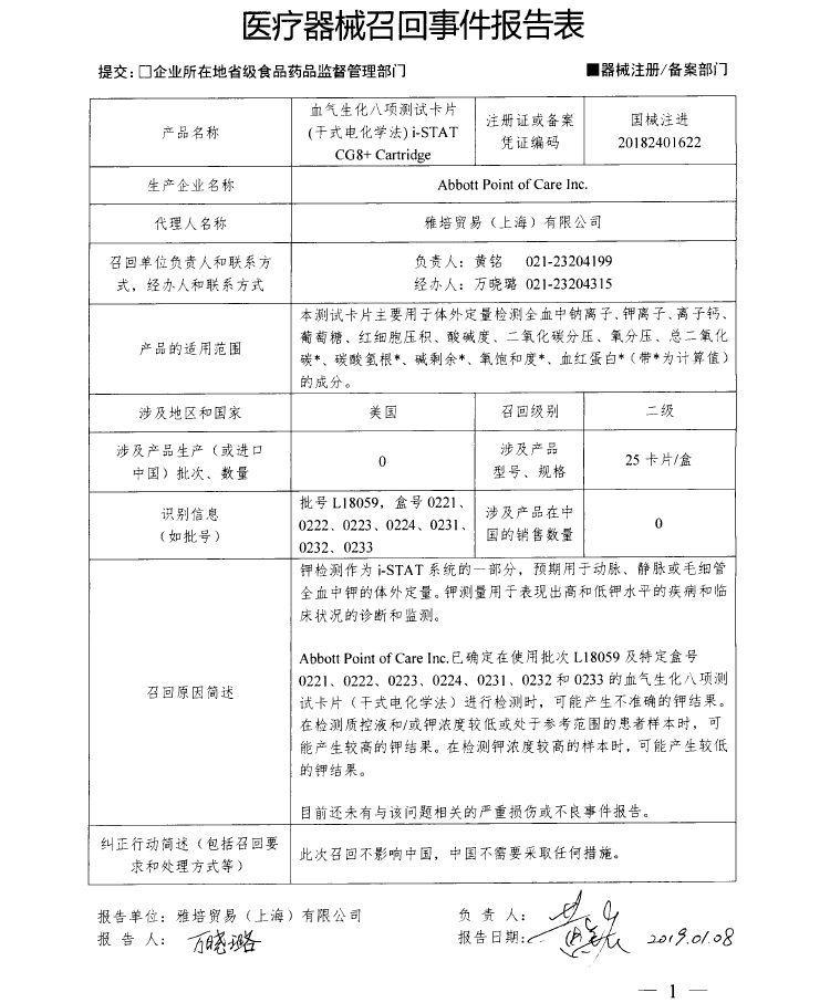 雅培貿(mào)易(上海)有限公司報告,由于涉及產(chǎn)品可能存在鉀離子的檢測結(jié)果不準(zhǔn)確的問題,生產(chǎn)商Abbott Point of Care Inc.對血氣生化八項測試卡片(干式電化學(xué)法)i-STAT CG8+ Cartridge(注冊證編號:國械注進20182401622)主動召回。召回級別為二級。涉及產(chǎn)品的型號、規(guī)格及批次等詳細信息見《醫(yī)療器械召回事件報告表》。