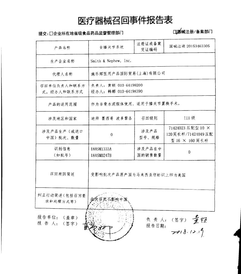 施樂輝醫(yī)用產(chǎn)品國(guó)際貿(mào)易(上海)有限公司報(bào)告,由于涉及產(chǎn)品原產(chǎn)地標(biāo)識(shí)錯(cuò)誤問(wèn)題,生產(chǎn)商Smith & Nephew, Inc.對(duì)全膝關(guān)節(jié)系統(tǒng)(注冊(cè)證編號(hào):國(guó)械注進(jìn)20153463305)主動(dòng)召回。召回級(jí)別為三級(jí)。涉及產(chǎn)品的型號(hào)、規(guī)格及批次等詳細(xì)信息見《醫(yī)療器械召回事件報(bào)告表》。