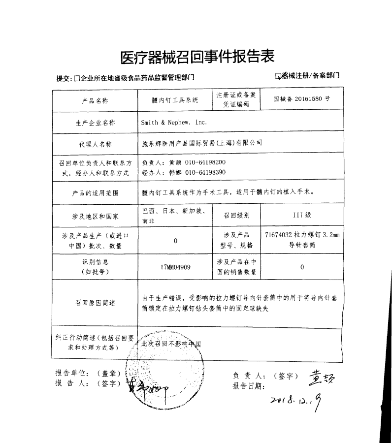 施樂輝醫(yī)用產(chǎn)品國際貿(mào)易(上海)有限公司報告,由于涉及產(chǎn)品生產(chǎn)錯誤,相關(guān)部件缺失,生產(chǎn)商Smith & Nephew, Inc.對髓內(nèi)釘工具系統(tǒng)(備案憑證編碼:國械備20161580號)主動召回。召回級別為三級。涉及產(chǎn)品的型號、規(guī)格及批次等詳細(xì)信息見《醫(yī)療器械召回事件報告表》。