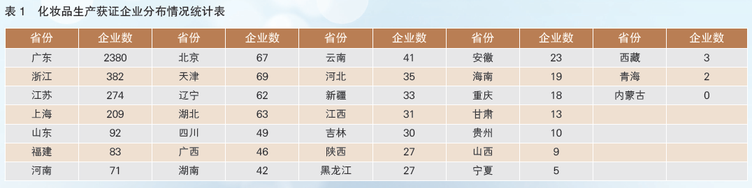 截至2017年12月29日,全國(guó)有4215家化妝品生產(chǎn)企業(yè)取得新的生產(chǎn)許可證,主要分布在廣東、浙江、江蘇、上海。其中,一半以上的企業(yè)位于廣東省,占全國(guó)總量的56.5%。由此可見我國(guó)化妝品產(chǎn)業(yè)分布極不均衡(見表1)。