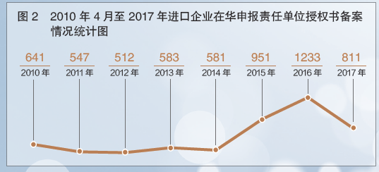 自2010年4月7日首家進(jìn)口企業(yè)法國(guó)歐潤(rùn)芙公司授權(quán)上海法妝商務(wù)咨詢有限公司作為在華申報(bào)責(zé)任單位的申請(qǐng)通過(guò)備案以來(lái),2011年至2015年的備案情況基本保持穩(wěn)定,2017年呈下降趨勢(shì)。其中,2015年至2016年備案數(shù)逐步上升,究其原因,主要有兩個(gè)方面:一是受856號(hào)文規(guī)定的在華申報(bào)責(zé)任單位授權(quán)書的授權(quán)有效期至少為4年,自首次進(jìn)行在華申報(bào)責(zé)任單位備案4年后,部分生產(chǎn)企業(yè)因授權(quán)到期而重新授權(quán);二是更多的進(jìn)口企業(yè)進(jìn)行首次授權(quán)備案(見圖2)。