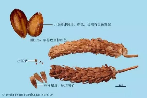 性狀鑒別:本品呈圓柱形,略扁,長(zhǎng)1.5~8cm,直徑0.8~1.5cm;淡棕色至棕紅色。全穗由數(shù)輪至10數(shù)輪宿萼與苞片組成,每輪有對(duì)生苞片2片,呈扇形,先端尖尾狀,脈紋明顯,外表面有白毛。每一苞片內(nèi)有花3朵,花冠多已脫落,宿萼二唇形,內(nèi)有小堅(jiān)果4枚,卵圓形,棕色,尖端有白色突起。體輕。氣微,味淡。