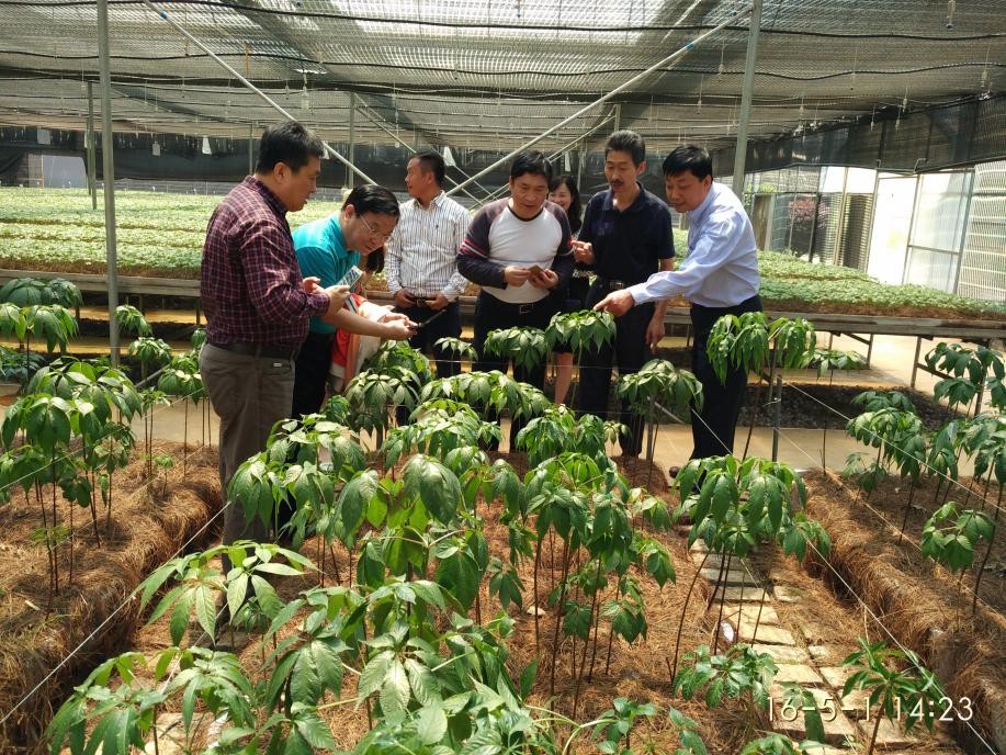圖1 筆者與中國中藥協(xié)會會長房書亭、全國中藥材物流專家委員會主任委員溫再興等在文山苗鄉(xiāng)考察三七種植。