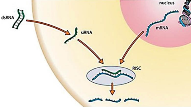 所謂RNAi,是指長(zhǎng)鏈雙RNA(dsRNA)被剪切為siRNA(小干擾RNA)后,與蛋白質(zhì)結(jié)合形成siRNA誘導(dǎo)干擾復(fù)合體(RISC),RISC再與互補(bǔ)的mRNA(信使RNA)結(jié)合,使靶基因mRNA降解,最終沉默特定基因表達(dá)。狹義的小核酸是指介導(dǎo)RNAi的短雙鏈RNA片斷,即siRNA;廣義的小核酸范圍則涵蓋了siRNA、miRNA(微小RNA)和反義核酸等。