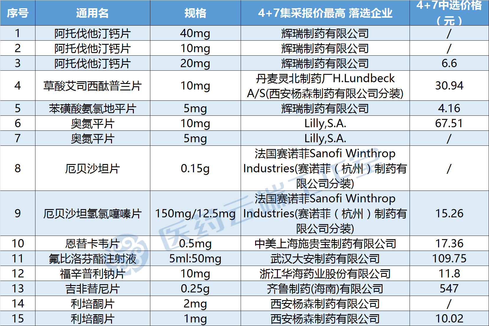 這張表格中,除了3個國內(nèi)藥企(齊魯、華海、大安)以外,其余都是外資藥企,包括輝瑞的立普妥、絡活喜、阿斯利康的可定、賽諾菲的波立維、益普生的思密達等等,這些藥品,在國內(nèi)市場上一直是領(lǐng)先的一線品牌,也都因為在4+7集采中報價最高而落選。