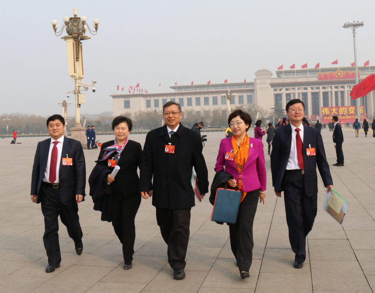 3月3日下午,全國政協(xié)十三屆二次會議在京開幕,全國政協(xié)醫(yī)藥衛(wèi)生界委員步入人民大會堂。圖為全國政協(xié)委員孫咸澤(中)、岳秉飛(右一)、肖新月(右二)、李萍(左二)、于圣臣(左一)。(中國食品藥品網(wǎng)記者陸悅 攝)