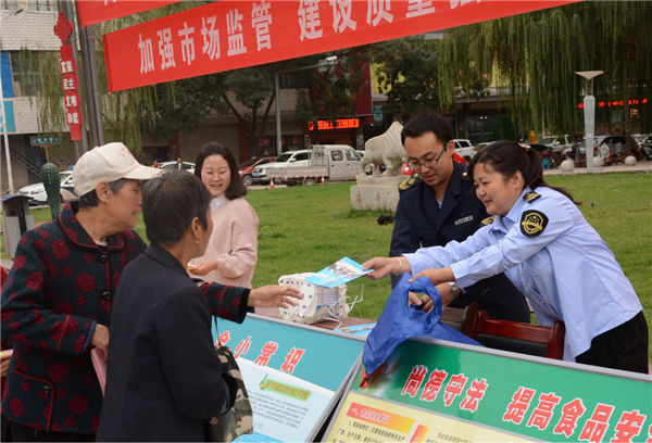 圖為甘肅省武山縣市場監(jiān)管局張瑜(右一)給群眾發(fā)放宣傳材料。丁怡媛 攝
