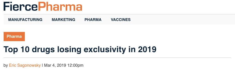 3月4日,國外醫(yī)藥網(wǎng)站FiercePharma發(fā)布了一份2019年可能面臨專利挑戰(zhàn)風(fēng)險(xiǎn)的十大藥物清單。