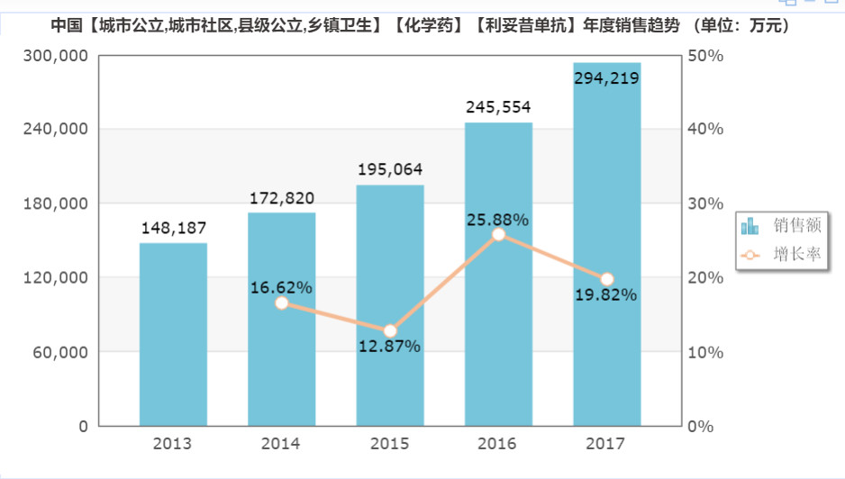 美羅華由羅氏銷售,2017年全球銷售額為79億美元,其中美國市場銷售額44.1億美元,該藥美國市場專利保護(hù)截止日期為2018年年中至年底。