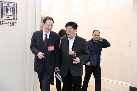 3月14日下午,十三屆全國人大二次會議舉行代表團全體會議,審議政府工作報告、全國人大常委會工作報告等內(nèi)容。圖為全國人大代表、揚子江藥業(yè)集團董事長徐鏡人(前右一)和全國人大常委會委員、全國人大教育科學(xué)文化衛(wèi)生委員會主任委員李學(xué)勇(前左一)在會議開始前進行交流。(《中國醫(yī)藥報》記者落楠 攝)