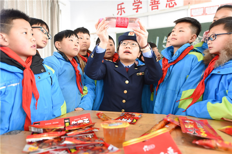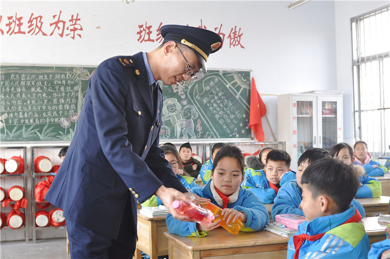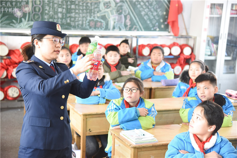 圖為東??h市場監(jiān)督管理局執(zhí)法人員在黃川鎮(zhèn)中心小學(xué)為學(xué)生講解如何辨別假冒偽劣食品。通訊員 張正友 攝