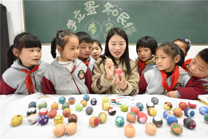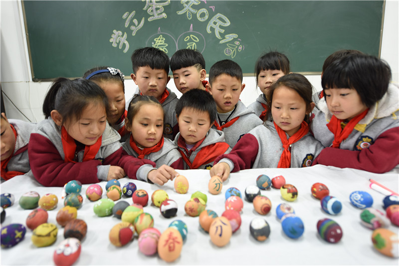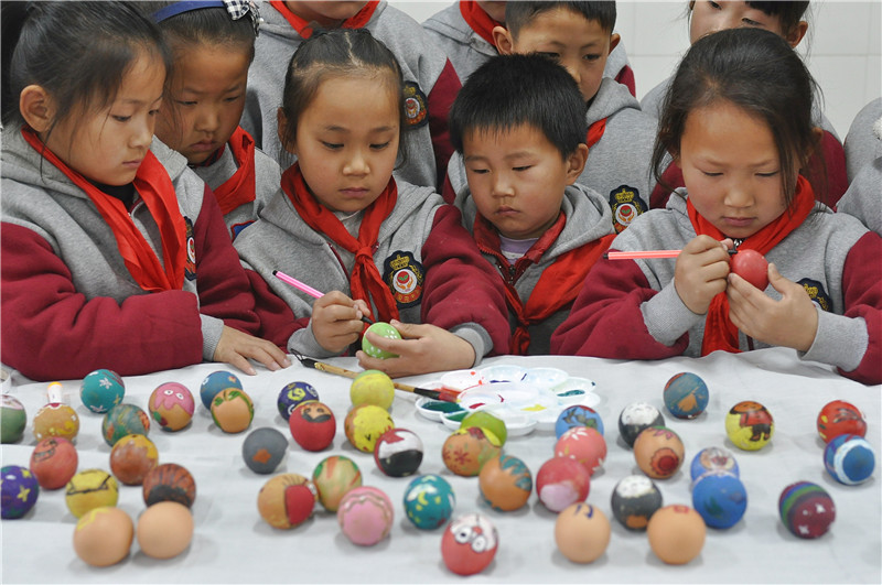 圖為東??h桃林鎮(zhèn)第二中心小學學生正在繪畫“彩蛋”。張玲 攝
