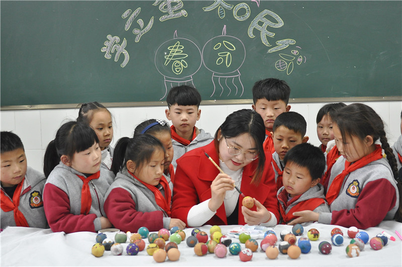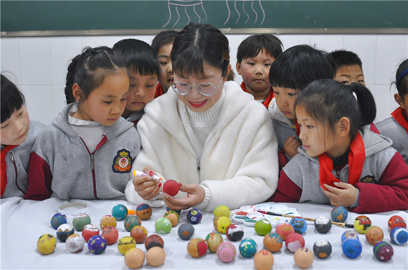 圖為東??h桃林鎮(zhèn)第二中心小學老師正在和學生互動繪畫“彩蛋”。張玲 攝