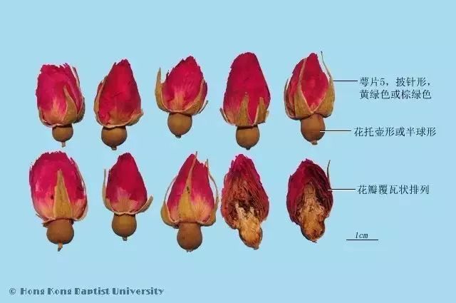 性狀鑒別:本品略呈半球形或不規(guī)則團(tuán)狀,直徑0.7~1.5cm。殘留花梗上被細(xì)柔毛,花托半球形,與花萼基部合生;萼片5,披針形,黃綠色或棕綠色,被有細(xì)柔毛;花瓣多皺縮,展平后寬卵形,呈覆瓦狀排列,紫紅色,有的黃棕色;雄蕊多數(shù),黃褐色;花柱多數(shù),柱頭在花托口集成頭狀,略突出,短于雄蕊。體輕,質(zhì)脆。氣芳香濃郁,味微苦澀。