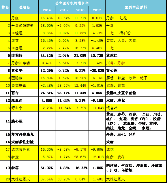 如表3,在國(guó)內(nèi)公立醫(yī)療機(jī)構(gòu)銷量前20位品種中,描黃色的是已被納入輔助用藥并重點(diǎn)監(jiān)控的品種,基本都是在醫(yī)療機(jī)構(gòu)銷售占比過高的中藥注射劑。被重點(diǎn)監(jiān)控后,其臨床銷售量預(yù)計(jì)會(huì)出現(xiàn)較大幅度下滑,從而影響到丹參、紅花、三七、人參等熱點(diǎn)中藥材的需求量。