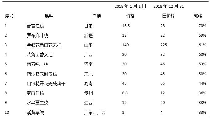 表1 2018年中藥材價(jià)格綜合200指數(shù)構(gòu)成品種漲幅前10位(中藥材天地網(wǎng))