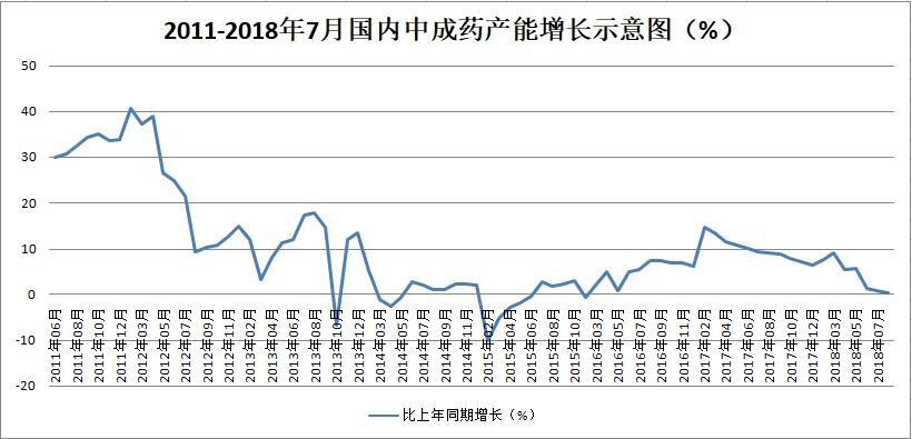 圖9 2011年-2018年7月,中成藥產(chǎn)能增長(zhǎng)示意圖(據(jù)米內(nèi)網(wǎng)數(shù)據(jù)整理)