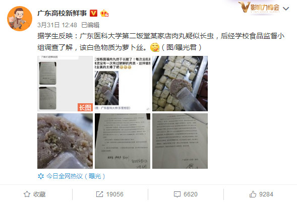中國(guó)食品藥品網(wǎng)訊 3月31日,有網(wǎng)友在微博向校園自媒體“廣東高校新鮮事”爆料廣東醫(yī)科大學(xué)東莞校區(qū)第二食堂存在食品安全問(wèn)題,學(xué)生在就餐時(shí)發(fā)現(xiàn)楊國(guó)福麻辣燙出售的肉丸長(zhǎng)蛆。