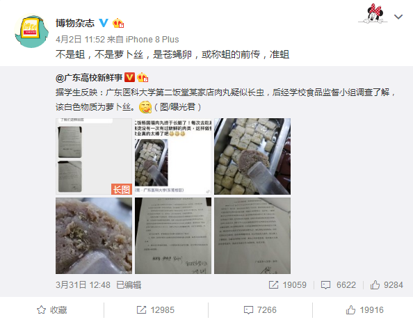 4月2日,在微博上極具影響力的千萬(wàn)粉絲博主“博物雜志”指出,圖片中的不明物體不是蛆,不是蘿卜絲,是蒼蠅卵,或稱蛆的前傳,準(zhǔn)蛆。再度引發(fā)網(wǎng)民的討論。此外,另?yè)?jù)媒體報(bào)道學(xué)校已就學(xué)生反映的問(wèn)題介入調(diào)查,調(diào)查過(guò)程中有學(xué)生代表參與,學(xué)校已經(jīng)要求楊國(guó)福麻辣燙停業(yè),將所有食材封存,另?yè)?jù)初步檢測(cè),楊國(guó)福麻辣燙店內(nèi)食材中沒(méi)有發(fā)現(xiàn)問(wèn)題。