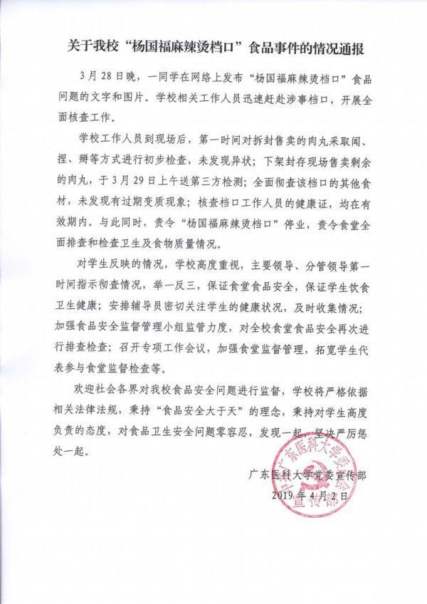 4月2日,廣東醫(yī)科大學(xué)黨委宣傳部表示,已責(zé)令 " 楊國(guó)福麻辣燙檔口 " 停業(yè),責(zé)令食堂全面排查和檢查衛(wèi)生及食物質(zhì)量情況。歡迎社會(huì)各界對(duì)學(xué)校的食品安全問(wèn)題進(jìn)行監(jiān)督,學(xué)校將嚴(yán)格依據(jù)相關(guān)法律法規(guī),對(duì)食品衛(wèi)生安全問(wèn)題零容忍,發(fā)現(xiàn)一起,堅(jiān)決嚴(yán)厲懲處一起。(郭厚杰 輯)