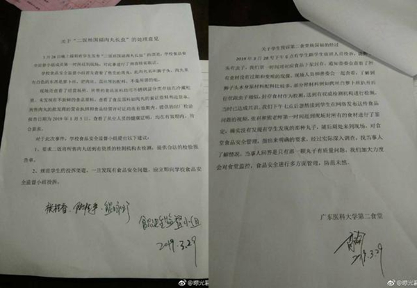 一份"食品安全監(jiān)督小組"的處理意見(jiàn)顯示,3月28日接到學(xué)生發(fā)布"二飯楊國(guó)福肉丸長(zhǎng)蟲"的消息,學(xué)校食品安全監(jiān)督小組成員第一時(shí)間趕到現(xiàn)場(chǎng)調(diào)查取證。學(xué)校食品安全監(jiān)督小組首先查看了收售賣的肉丸,名叫獅子頭,肉丸里有白色的東西是蘿卜絲、肥肉絲、蒜絲等配料,不是所謂的蛆。另一份“廣東醫(yī)科大學(xué)第二食堂”的處理意見(jiàn)表示,工作人員接到投訴后第一時(shí)間對(duì)對(duì)應(yīng)食品下架封存,通知膳委會(huì)查看了所有食材,沒(méi)有過(guò)期和變質(zhì)的現(xiàn)象。