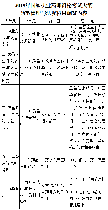 為做好2019年國家執(zhí)業(yè)藥師資格考試工作,受國家藥品監(jiān)督管理局委托,國家藥品監(jiān)督管理局執(zhí)業(yè)藥師資格認證中心根據《國家執(zhí)業(yè)藥師資格考試大綱(第七版)》(以下簡稱《大綱》)相關規(guī)定,確定2019年執(zhí)業(yè)藥師資格考試藥事管理與法規(guī)科目大綱部分內容調整事宜。經審核同意,現通告如下。從本通告發(fā)布到今年十月份考試之間,國家新印發(fā)或修訂的藥事管理法律法規(guī)原則上不納入今年的考試內容和命題范圍。