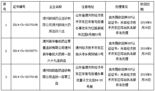 德州:3家藥品零售企業(yè)《藥品經(jīng)營質(zhì)量管理規(guī)范認證證書》被收回