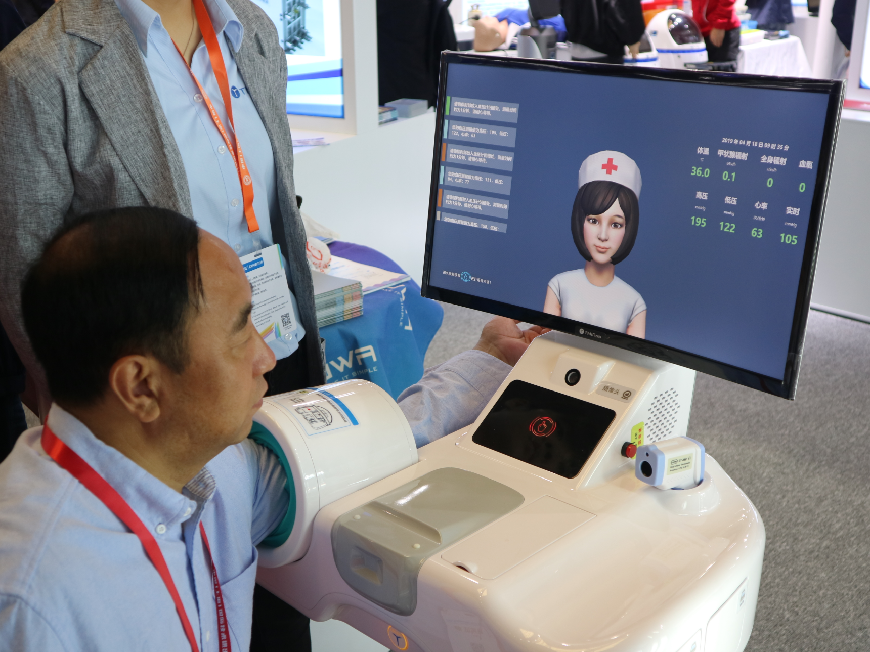 在高校展區(qū)旁邊,上海鈦米機(jī)器人科技有限公司的一臺(tái)核醫(yī)學(xué)科醫(yī)療服務(wù)機(jī)器人正在為一位老人測量血壓。據(jù)工作人員介紹,核醫(yī)學(xué)科醫(yī)療服務(wù)機(jī)器人以移動(dòng)機(jī)器人為載體,在機(jī)身上搭載血壓計(jì)、體溫計(jì)、蓋格計(jì)數(shù)器等多款醫(yī)療設(shè)備,可以代替醫(yī)護(hù)人員對患者進(jìn)行日常的體征檢測、醫(yī)學(xué)知識(shí)宣教、藥物配送、室內(nèi)放射值測量等工作,同時(shí)還支持患者與醫(yī)生護(hù)士的遠(yuǎn)程視頻?!皺C(jī)器人能夠代替醫(yī)護(hù)人員進(jìn)入輻射隔離區(qū),執(zhí)行病人生命體征測量,在保護(hù)醫(yī)護(hù)人員安全的同時(shí),可最大程度進(jìn)行患者的精細(xì)化管理。”
