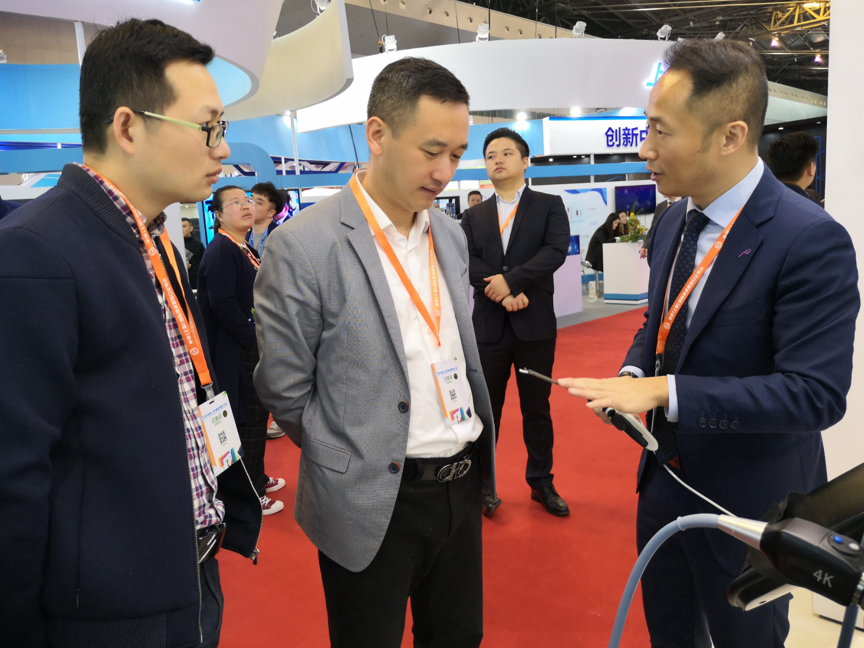 “這款easyOR一體化微創(chuàng)中心集成了4K超高清技術(shù)和熒光技術(shù),并把所有手術(shù)室設(shè)備的光纜、電線全都‘藏’進(jìn)了吊臂。醫(yī)生在顯示屏上能清晰地看到腔內(nèi)神經(jīng)叢和淋巴組織細(xì)節(jié),更適用于精細(xì)分離手術(shù)。”逸思醫(yī)療的工作人員正在講解一例腫瘤切除手術(shù)過程,他的周圍聚集了很多觀眾。