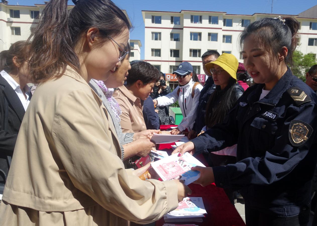 內(nèi)蒙古自治區(qū)化妝品安全科普宣傳周啟動(dòng)儀式現(xiàn)場(chǎng),工作人員正在發(fā)放科普宣傳資料。 楊燕/攝